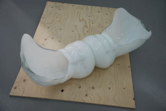 Coming back from South Korea, Marie Lelouche sweeps Alberta Pane Gallery with a double exhibition, inspired from her stay in the Land of the Morning Calm, (Goyang Art Studio 2010 and Nanji art studio 2011). This young French artist, born in 1984 and graduated in 2008 from Ensba (Paris), is specialized in the sophisticated arts of blown glass and porcelain, which she combined to raw materials, such as fabric or wood, by questioning the material limits to derive unequaled shapes.