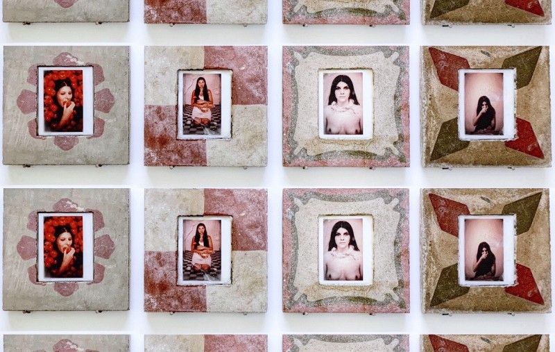 It includes, among other performative, photographic and video works, a selection of polaroids framed within cement tile - old house paving from Southern Italy.
